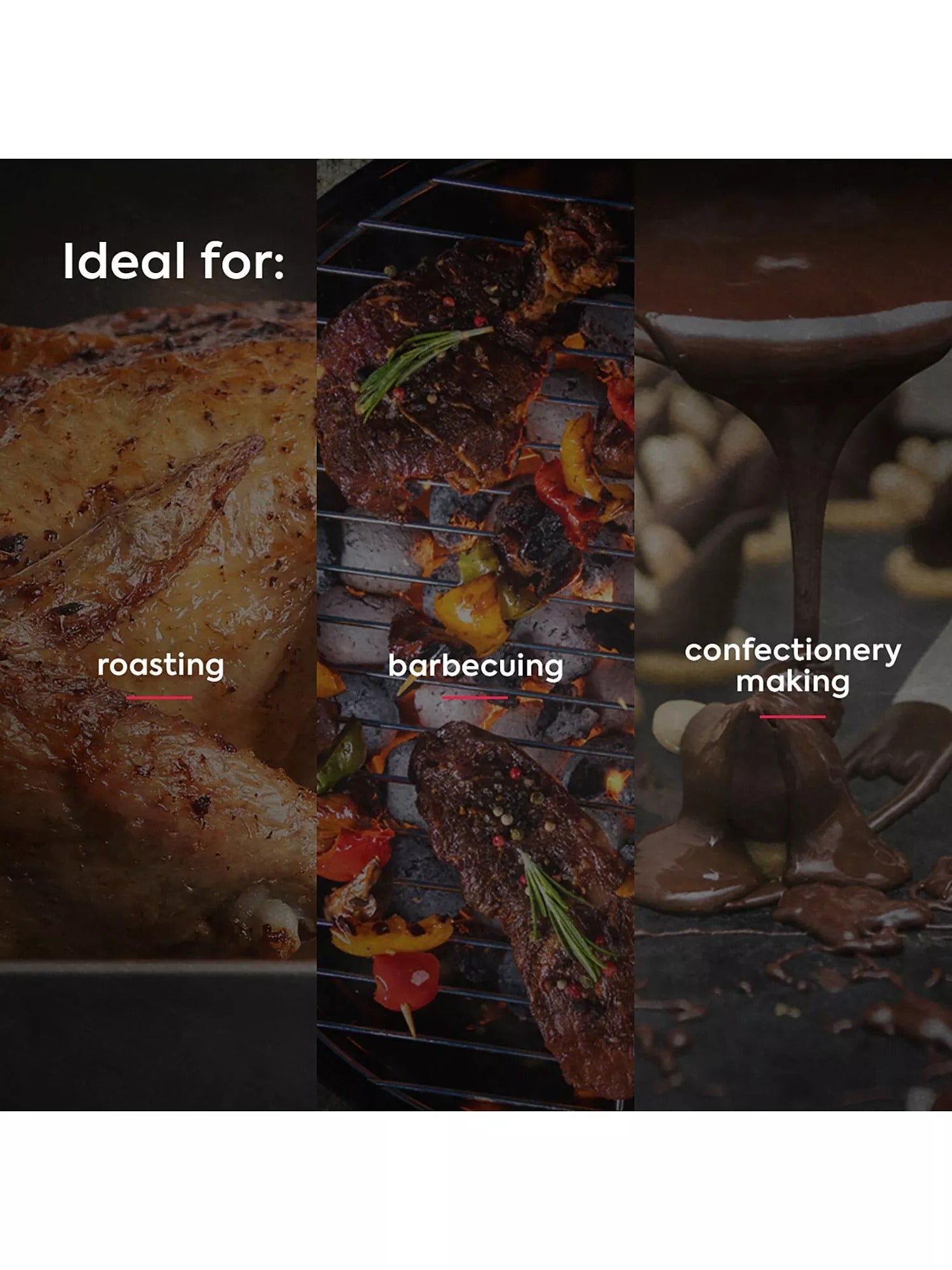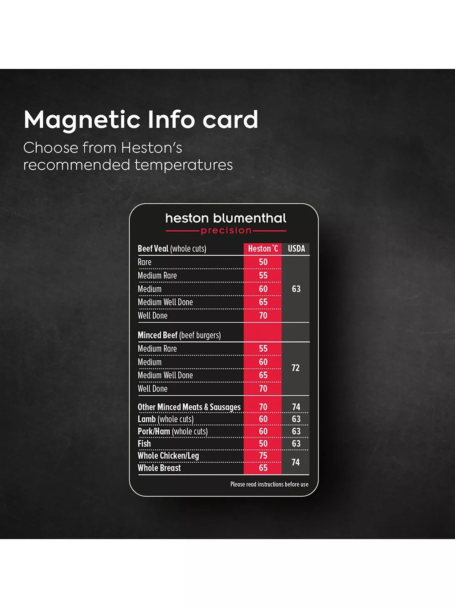 Measuring temperatures quickly and accurately, the precision thermometer is perfect for checking the temperature of meat, jam, confectionery, BBQ food and more. Use the ‘info card’ for Heston’s recommended temperatures and serve up succulent meat without hassle. You can simply slot the thermometer into the clip on the probe case when using over a hot pan.