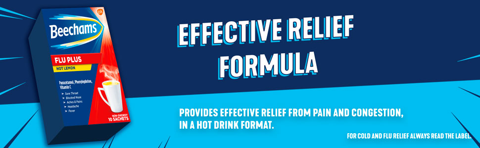 Product Description: Paracetamol Phenylephrine Vitamin C Each sachet contains: Ingredients: Paracetamol 1000 mg, Action: Painkiller and fever reducer, Relief of: Headache, sore throat, shivers, fever, aches & pains Ingredients: Ascorbic Acid 40 mg, Action: Vitamin C, Relief of: Compensates for vitamin C commonly lost during colds Ingredients: Phenylephrine Hydrochloride 10 mg, Action: Decongestant, Relief of: Blocked nose, painful sinuses What are they for? Beechams Flu Plus Hot lemon powder for oral solution provides relief from the symptoms of colds and flu, including feverishness and chills, headache, sore throat pain, aching limbs, blocked nose and painful sinuses.