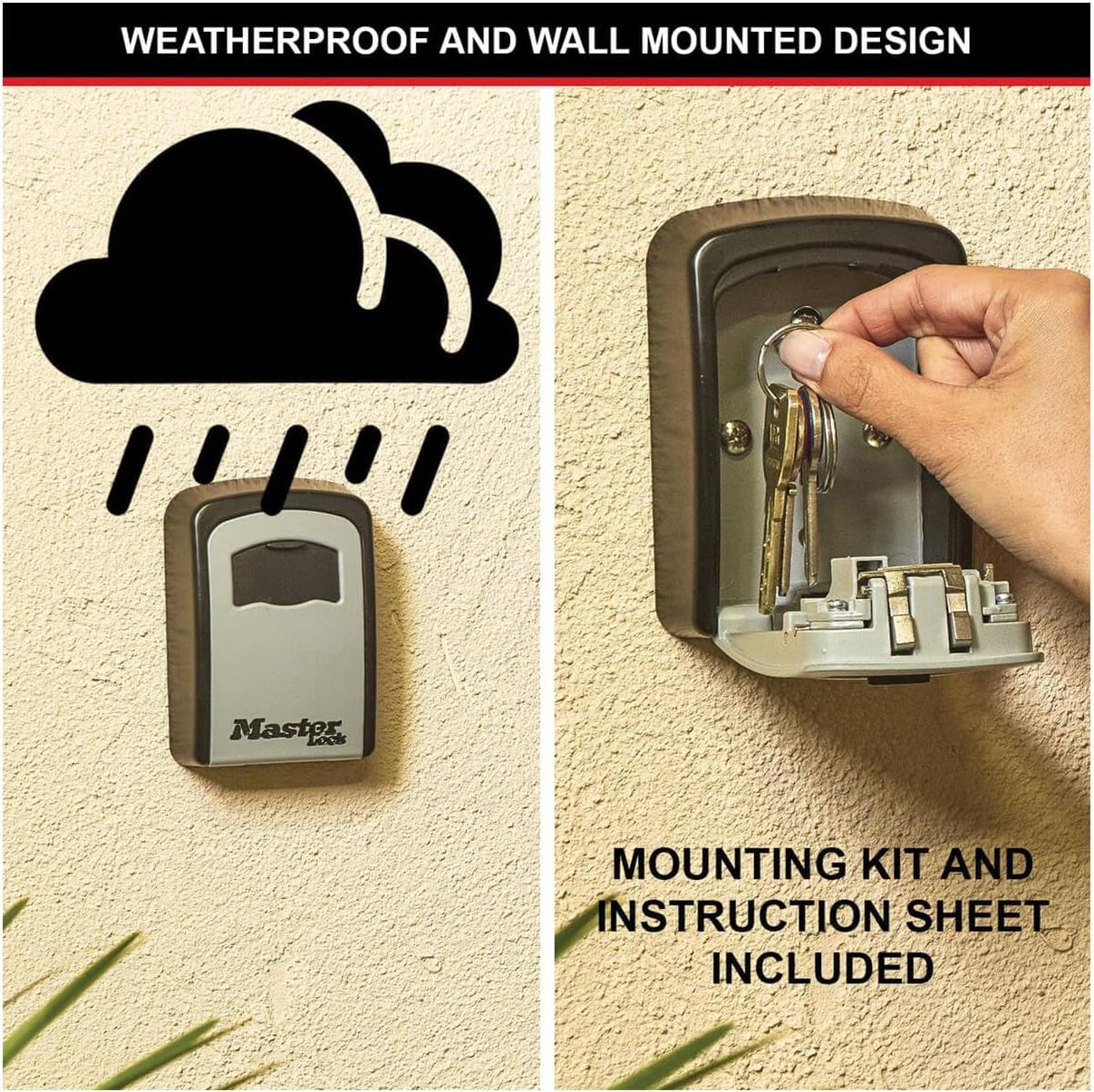 Durable design: lockable key storage designed for installation to a wall or other fixed object; metal body construction for durability and shutter door to protect combination dials from weather