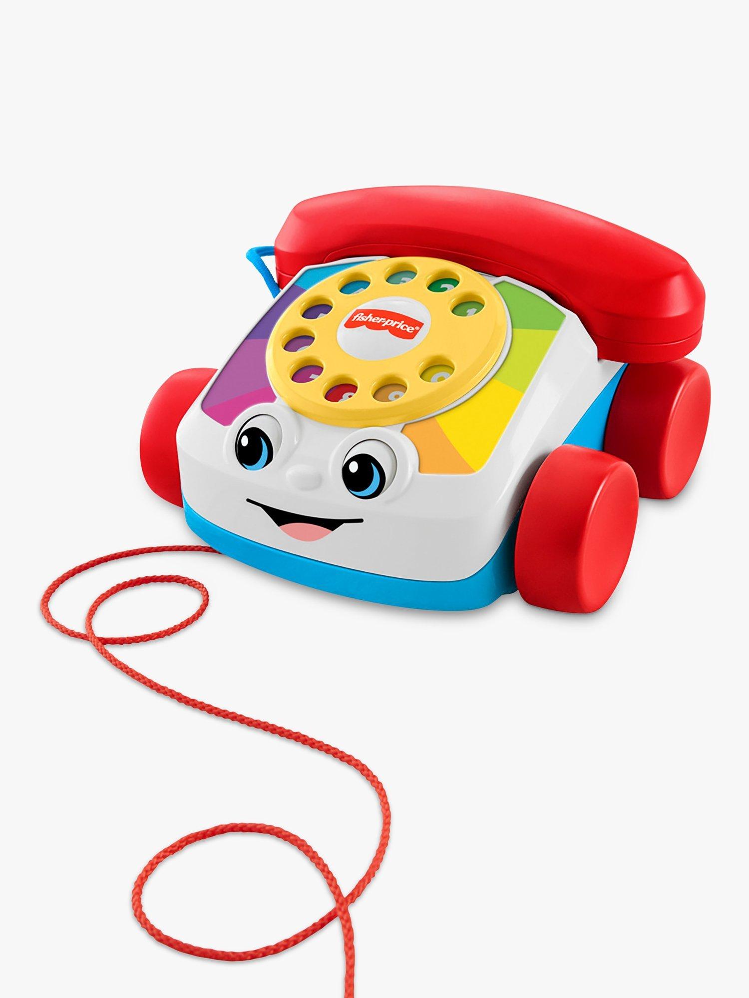 The iconic Fisher-Price Chatter Telephone toy has been dialling up fun since 1961! With a friendly face, spinning dial, ringing-phone sounds and eyes that move, this classic pull toy helps get your baby chatting and strolling like a pro! Babies can walk the walk and talk the talk as they pull this phone along, strengthening gross motor skills along the way. Encourage imaginative play by pretending to phone a friend as they spin the dial and pick up and hang up the handset.