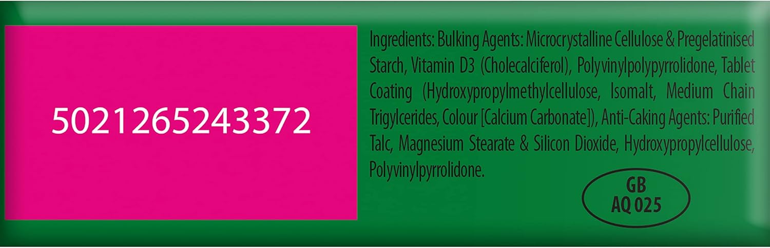 Ingredients: <p><b>Tablet Ingredients:</b> Bulking Agents: Microcrystalline Cellulose & Pregelatinised Starch, Vitamin D3 (Cholecalciferol), Polyvinylpolypyrrolidone, Tablet Coating (Hydroxypropylmethylcellulose, Glycerin, Natural Source Colour [Titanium Dioxide]), Anti-Caking Agents: Purified Talc, Magnesium Stearate & Silicon Dioxide, Hydroxypropylcellulose, Polyvinylpyrrolidone.